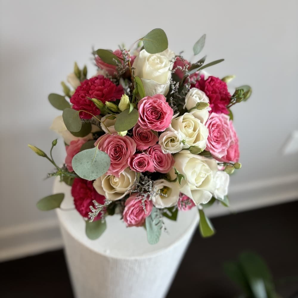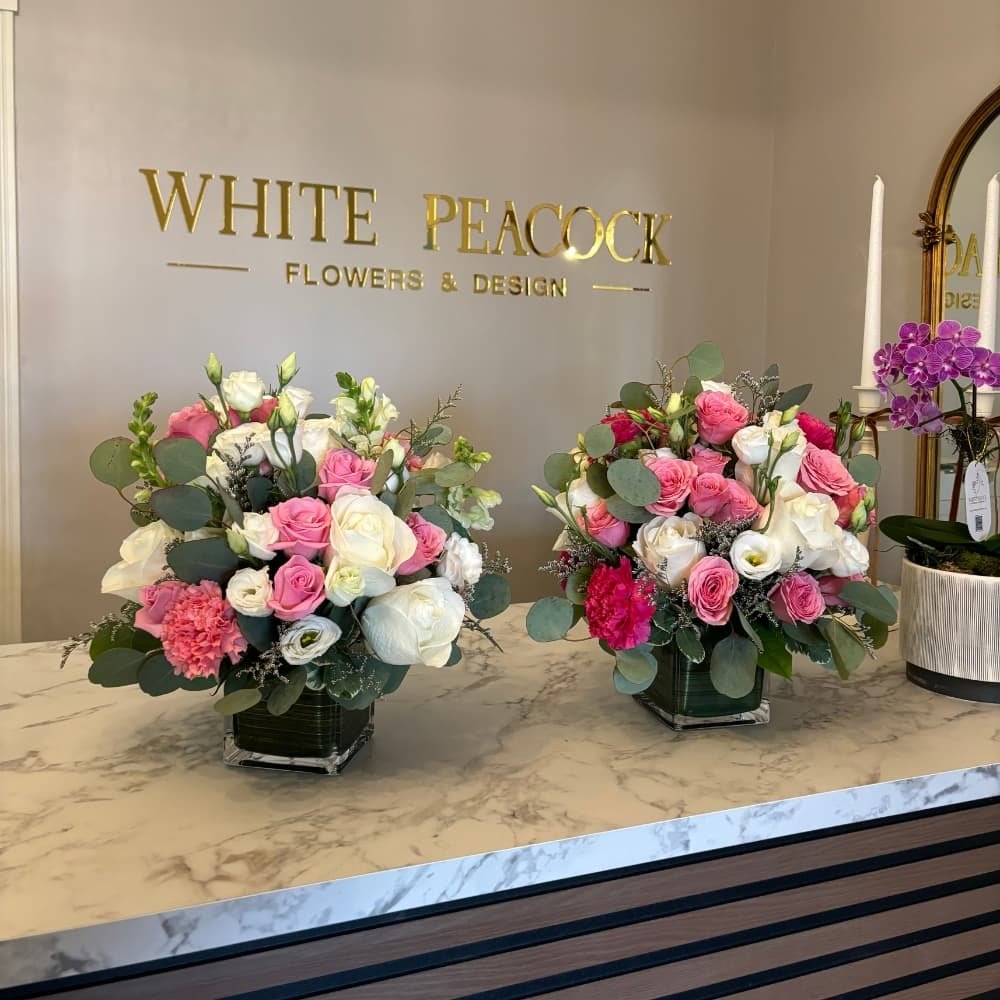A modern yet timeless design, Forever in Bloom, is presented in a sleek glass cube and features a graceful medley of blooms. Lush white roses and delicate lisianthus create a foundation of purity, while pink spray roses and vivid hot pink carnations add layers of romance and vibrancy. Accents of airy limonium, fresh seasonal greens, and the soft texture of silver dollar eucalyptus complete the composition. The result is a sophisticated arrangement that balances elegance with a lively touch of color, perfect for expressing both charm and refinement.