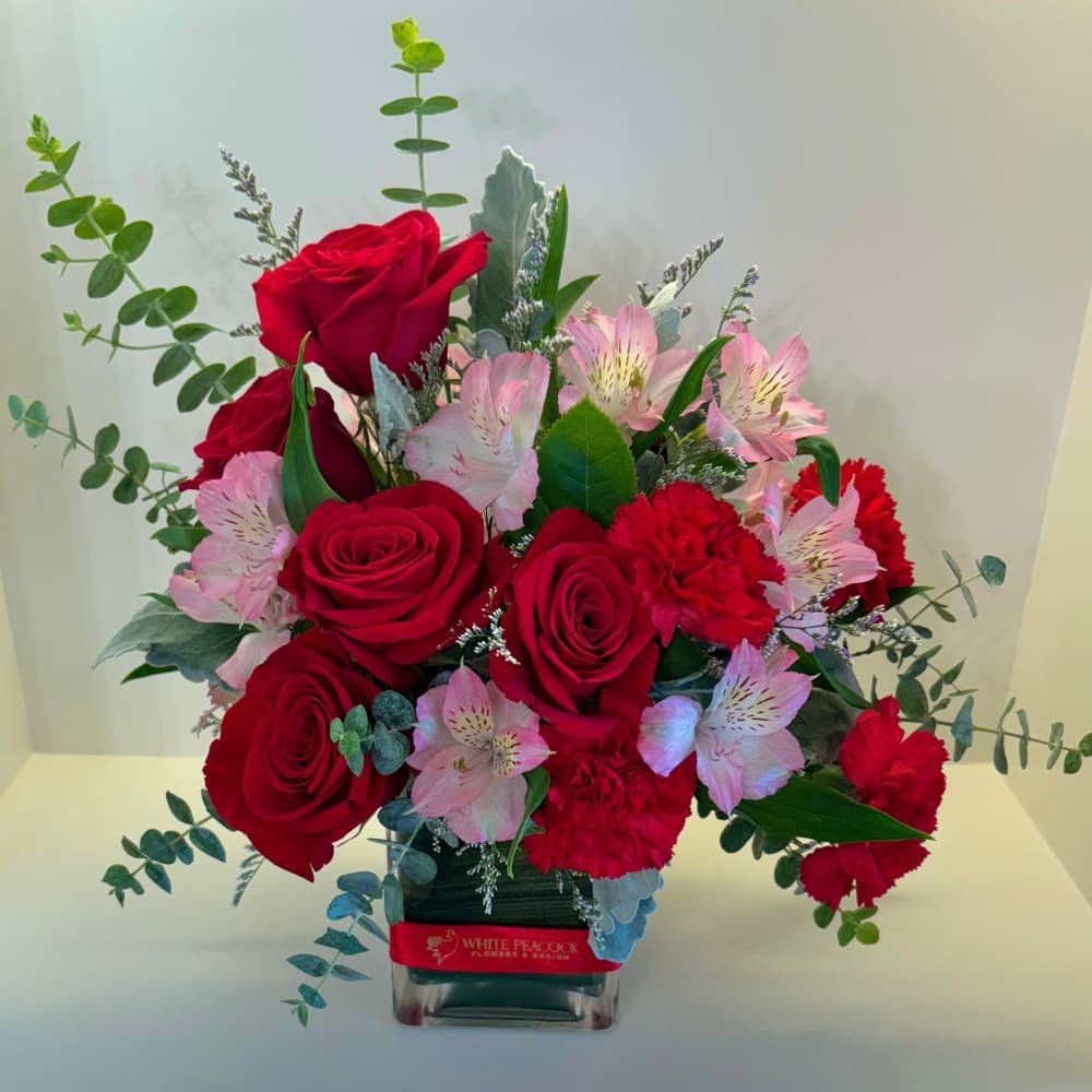 This exquisite 360-degree floral arrangement is artfully presented in a refined glass vase, offering beauty from every angle. It features luxurious red Ecuadorian roses and vibrant red carnations, complemented by delicate pink alstroemeria. Soft accents of limonium, fragrant eucalyptus, and silvery dusty miller add texture and elegance, creating a harmonious blend of color and form.
