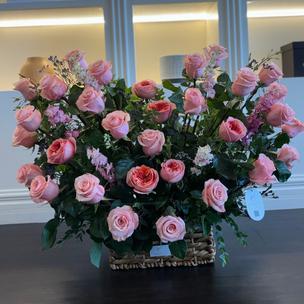 Featuring radiant Ecuadorian pink roses, this exquisite composition is beautifully accented with delicate pink larkspur, soft touches of limonium, eucalyptus, and fresh greenery. Each element is meticulously selected and artfully arranged to create a romantic, timeless display that exudes graceful elegance and heartfelt emotion.