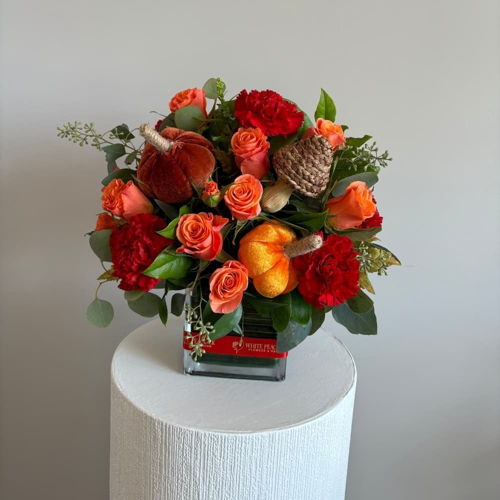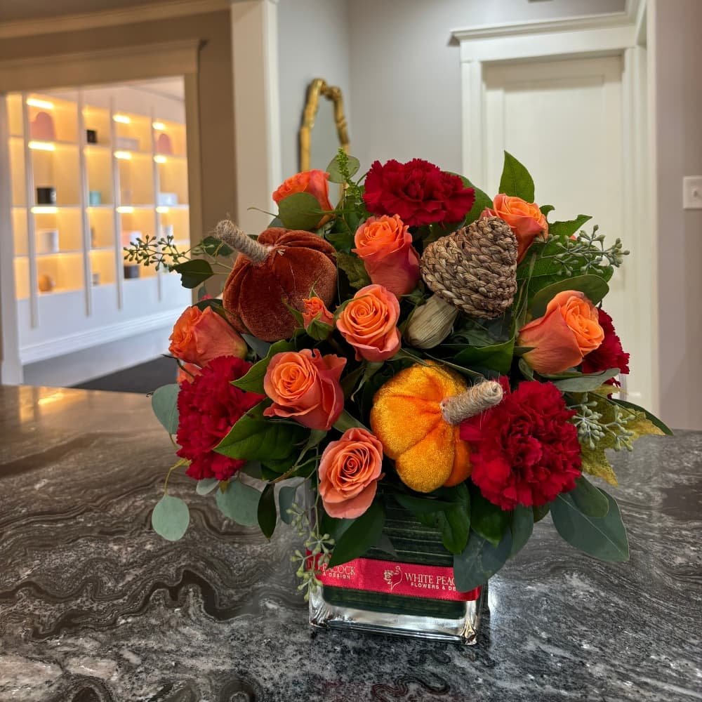 Harvest Ember captures the quiet glow of autumn’s golden hour with a warm, refined palette. Vibrant orange spray roses and rich red carnations evoke the essence of falling leaves, complemented by fresh greenery and wisps of eucalyptus for a touch of natural grace. Accented with a petite pumpkin and a rustic brown mushroom, this arrangement blends seasonal charm with understated elegance perfect for a thoughtful centerpiece or a welcoming autumn display.