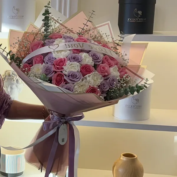 Featuring premium long-stem Ecuadorian roses in delicate shades of pink and lavender, this elegant bouquet is beautifully paired with fresh white carnations and softly accented with eucalyptus greenery. Hand-wrapped in high-quality paper, the refined color palette and thoughtful design create a composition that feels both luxurious and heartfelt.