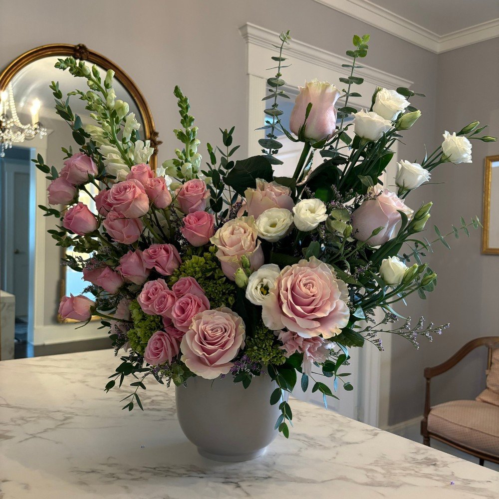 A harmonious composition that speaks the language of elegance, Love in full Bloom is a refined floral arrangement designed to evoke serenity and timeless beauty. Towering white snapdragons lend vertical elegance, gracefully complemented by the soft, romantic blooms of white lisianthus. Blush-toned Ecuadorian roses and delicate pink spray roses add a whisper of warmth, while green hydrangeas bring a touch of fresh vibrancy. The ensemble is further enriched with the gentle charm of pink carnations and the airy texture of lavender limonium. Accents of eucalyptus and ruscus provide a lush, verdant foundation, weaving through the bouquet with natural ease and sophistication. Perfect for elevating any refined occasion or as an exquisite gesture of thoughtfulness, is a celebration of poise, beauty, and botanical artistry.