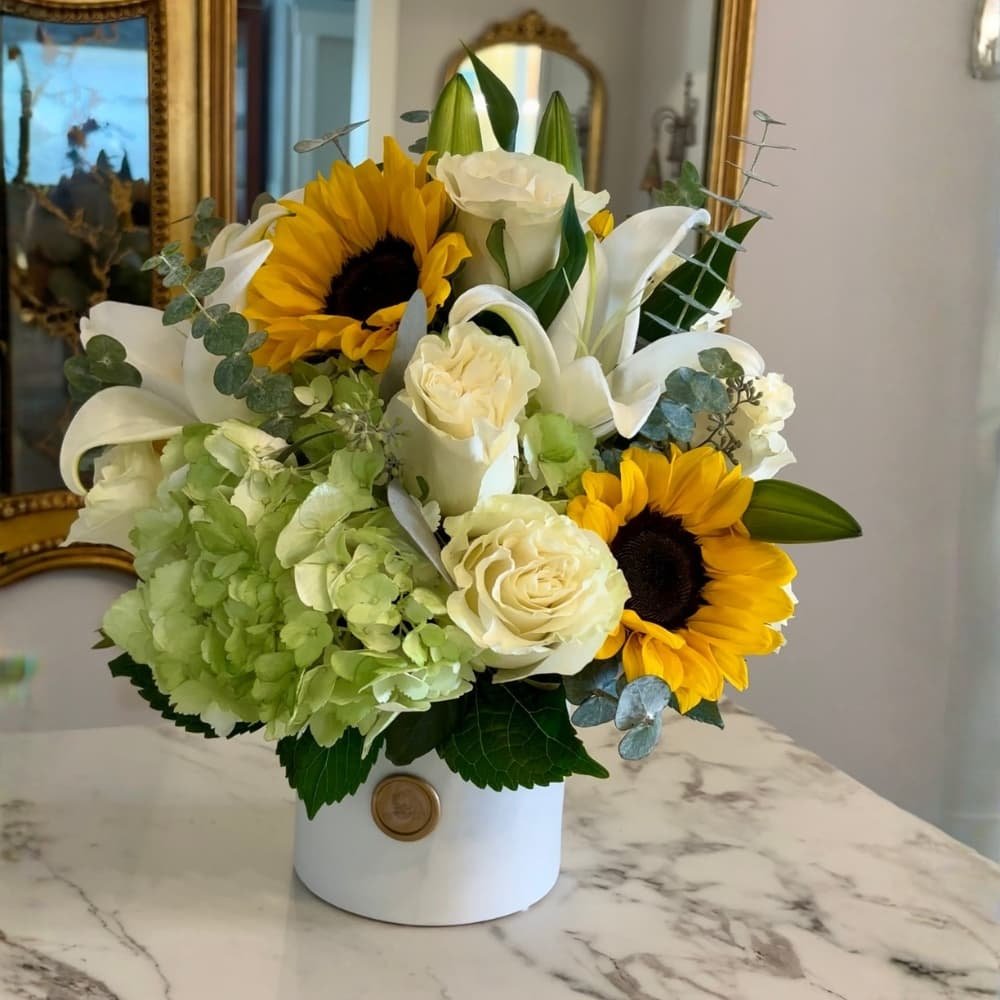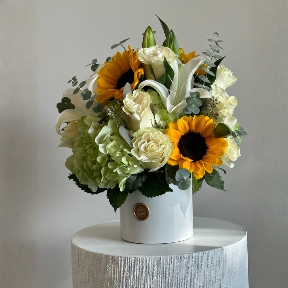A stunning expression of elegance and sophistication, Luminous Harmony features lush green hydrangeas, pristine white Ecuadorian roses, and delicate white lilies, perfectly complemented by bright sunflowers and a variety of fragrant eucalyptus. Arranged in a sleek white ceramic vase, this composition radiates timeless beauty and graceful charm, making it a captivating centerpiece for any setting.