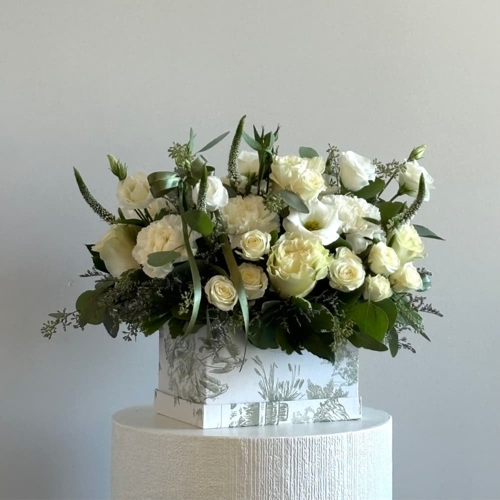 A truly elegant composition, this rectangular box showcases a harmonious palette of crisp whites and lush greens. Featuring delicate lisianthus, graceful spray roses, classic roses, soft carnations, and slender veronicas, the design is enriched with textured seeded eucalyptus, fresh seasonal greens, and touches of limonium. The result is a sophisticated arrangement that radiates timeless beauty, purity, and refinement, perfect for any occasion that calls for grace and elegance.