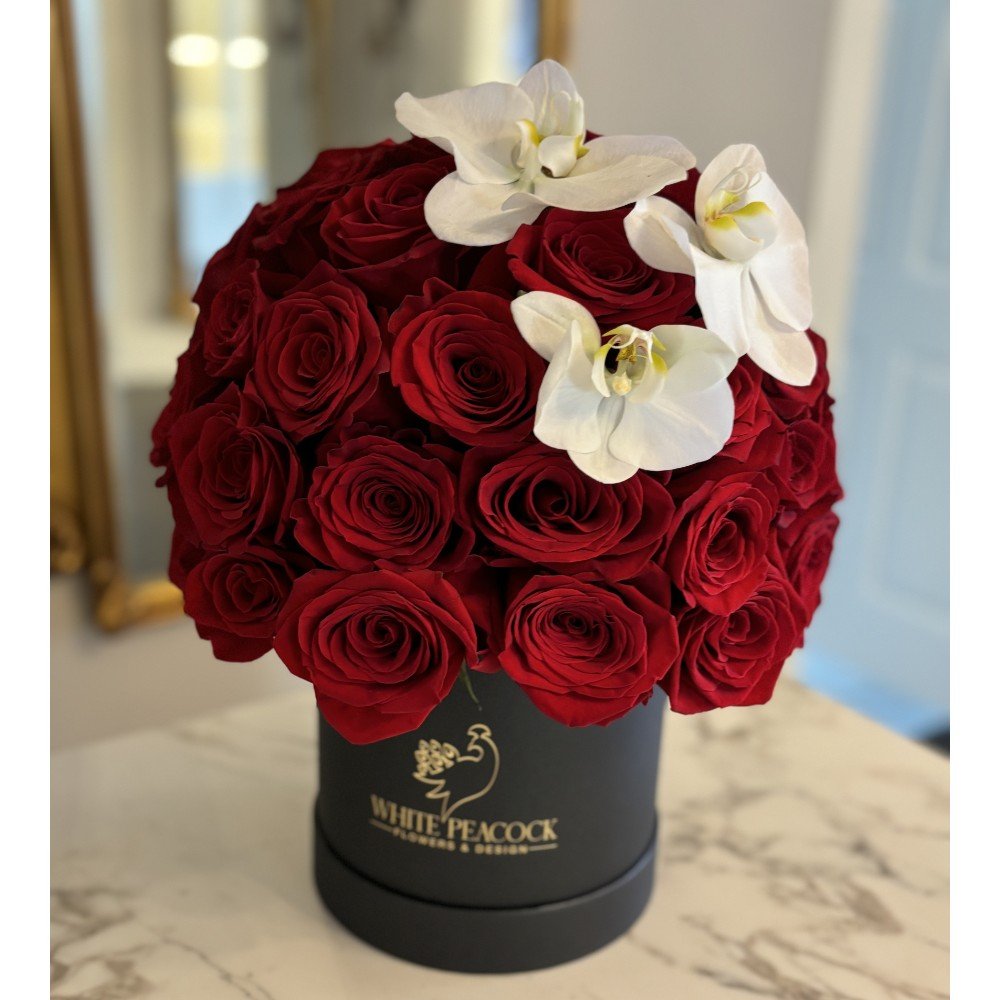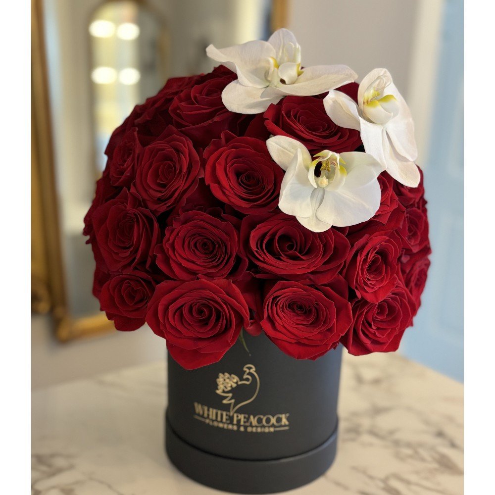 Indulge in timeless elegance with this luxurious floral arrangement, Red Velvet Romance, renowned for their exceptional size, vibrant color, and lasting beauty. Nestled in a sleek black satin box, the deep crimson roses create a striking contrast that exudes sophistication and romance. To elevate the design, three delicate orchids are artfully placed atop the arrangement, adding a graceful and modern touch. Perfect for making a bold statement on anniversaries, romantic gestures, and unforgettable high-end moments.