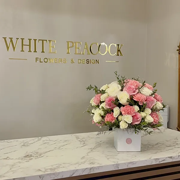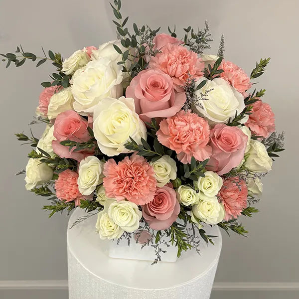 This elegant floral arrangement features pristine white Ecuadorian roses and spray roses, beautifully complemented by soft pink roses and delicate pink carnations. Accents of fresh eucalyptus add a natural, serene finish, while the sleek white ceramic cube vase enhances the refined, romantic aesthetic of the design.