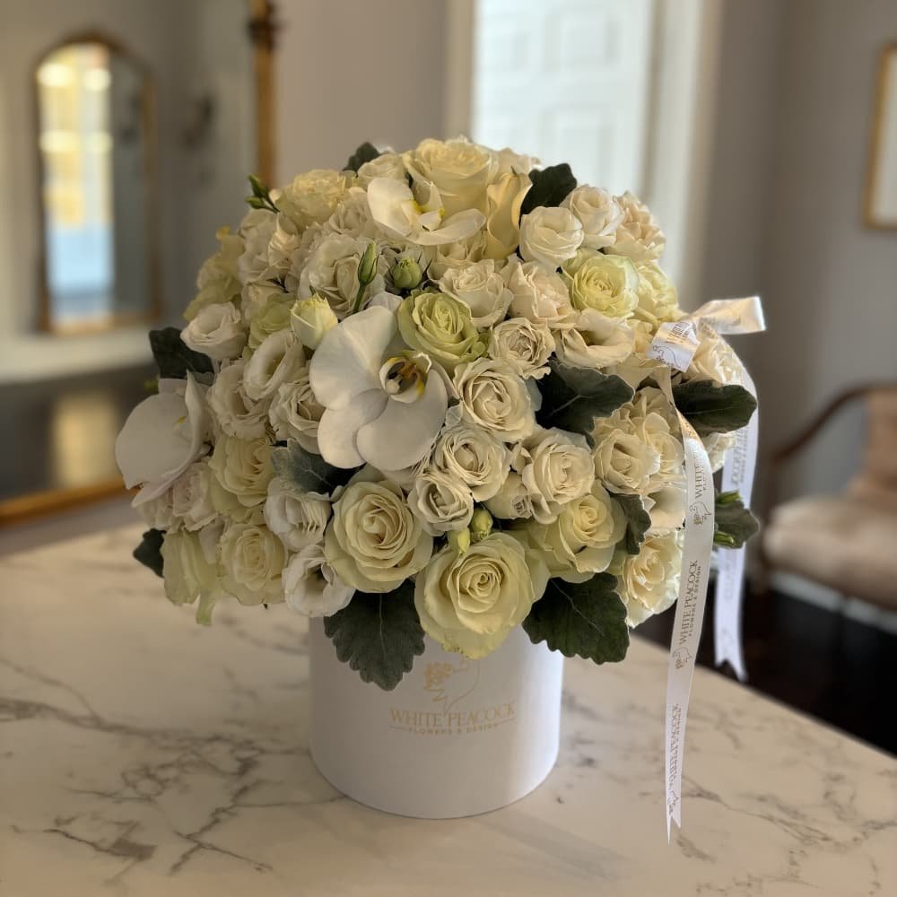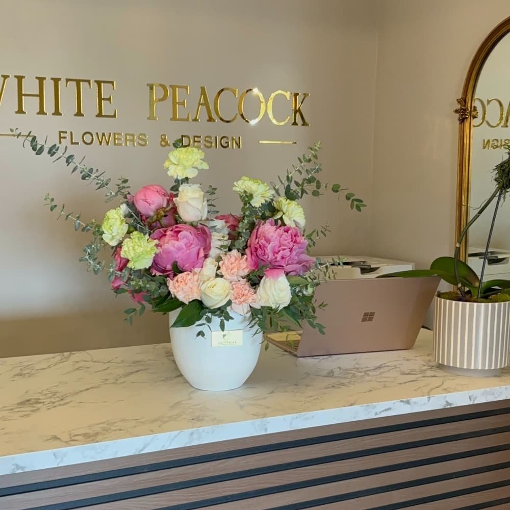 A romantic composition that breathes softness and grace, Sweet Peony Sigh is a lush, garden-inspired 360° floral arrangement designed to enchant from every angle. At its heart, delicate pink peonies bloom with effortless elegance, beautifully paired with pristine white Ecuadorian roses—each chosen for their full, velvety petals and timeless allure. Soft peach and muted green carnations introduce depth and texture, while a curated medley of eucalyptus varieties weaves throughout, adding a natural sense of movement and a fresh, calming fragrance.